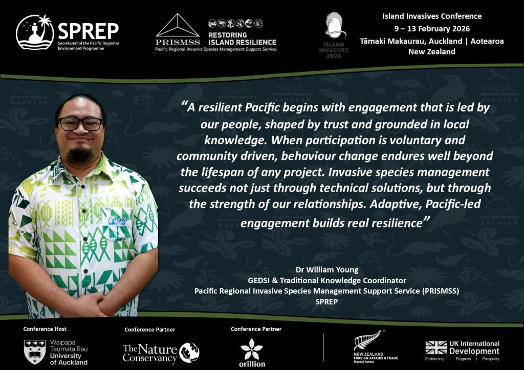 Dr William Young concluded by sharing that, โ€œinvesting in adaptive, Pacific-led engagement is essential for building long-term island resilience, as when communities trust the process and see their knowledge reflected, participation becomes voluntary rather than enforced, which is critical for long-term invasive species management where sustained behaviour change is required beyond the life of a project.โ€