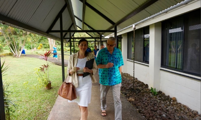 SPREP Deputy Director General, Roger Cornforth, tours the Minister of International Development and the Pacific from the Australian Department of Foreign Affairs and Trade, Honourable Senator Concetta Fierravanti-Wells, around the SPREP campus, with the Pacific Climate Change Centre site in the background. Photo: SPREP.