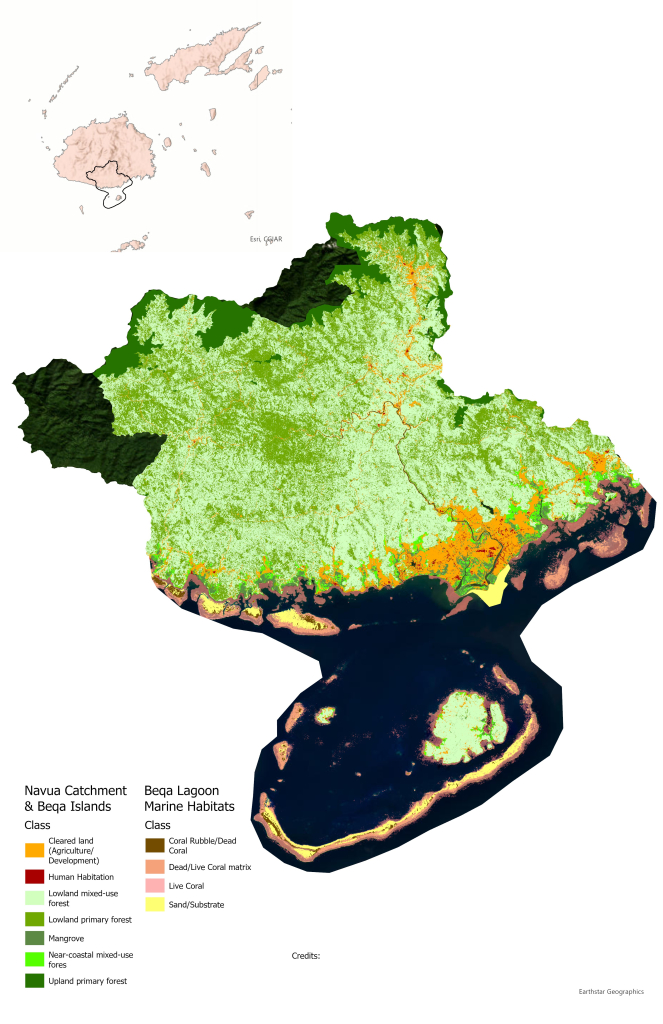The Navua River catchment drains an area of 1387 km2 from the Namosi highlands right to the mouth of the Navua River and into Beqa Lagoon. River catchments and coastal areas like this, form connected ecological systems and it is important that these ecological systems be managed as a connected system. What happens upstream impacts downstream activities like agriculture and fishing.