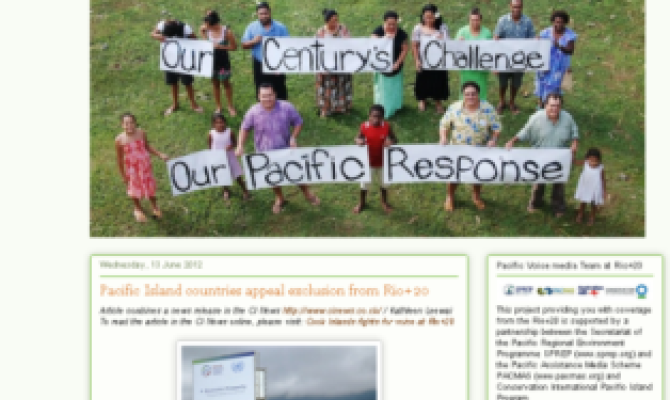 This project providing you with coverage from the Rio+20 is supported by a partnership between the Secretariat of the Pacific Regional Environment Programme SPREP (www.sprep.org) and the Pacific Assistance Media Scheme PACMAS (www.pacmas.org) and Conservation International Pacific Island Program.